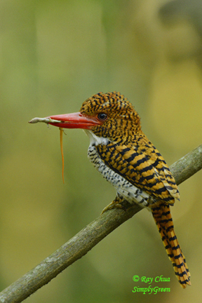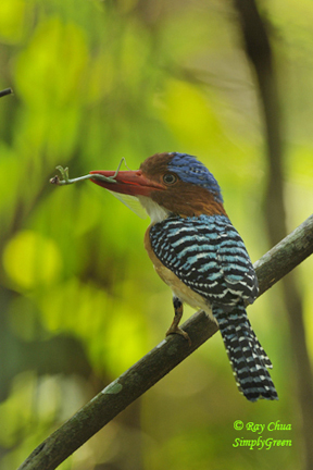 Banded Kingfisher The Banded Kingfisher has a red bill. Males have chestnut foreheads, cheeks and nape, and a bright blue cap with wings and tail are black with blue bands. Females have black-and-rufous-banded upperparts. A lowland rainforest, it feeds on insects and lizards. |