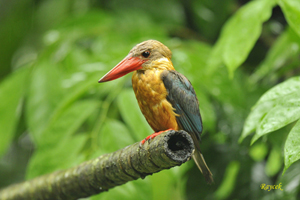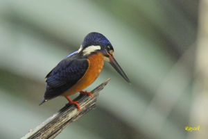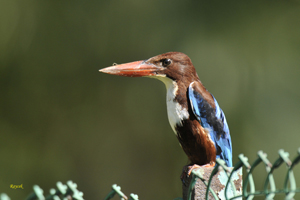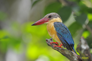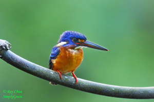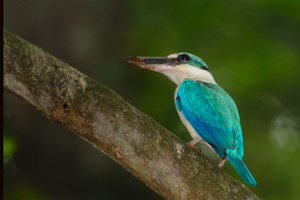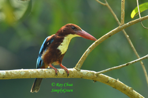The large Stork-billed Kingfisher has an enormous bill and is most impressive. The diminuitive Common Kingfisher migrates to Singapore during the months of August to April. The Collared Kingfisher is common and is the most aggressive; often chasing birds from their nesting sites or even taking over their nesting sites. The White-throated or White-breasted Kingfisher is also common. The Blue-eared Kingfisher is a forested bird and is uncommon here.