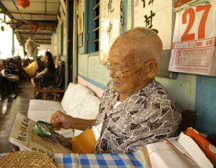 He grew frail with the years but he still travelled in his wheelchair with his maid. He readily offered a wave of his hand if anyone acknowledged him. He was also stoic when faced with cancer in 1995 and although his family members help him recuperate on the mainland; his appetite was poor. Back on the island, he ate well. Pulau Ubin is where his heart truly belonged. He would sit by himself and peer the newspapers with a magnifying glass. It was one of my most memorable image of him in that pose and was the last time I photographed him.