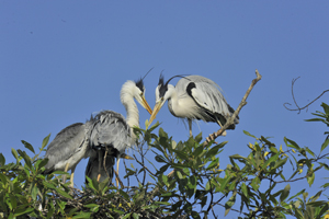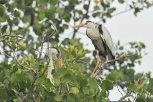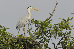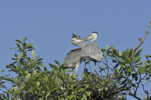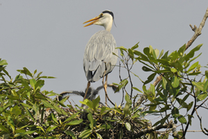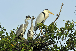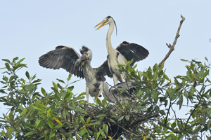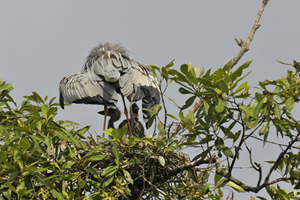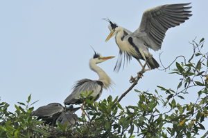 A number grey Heron nests started to sprout at the Pasir Ris mangroves. Breeding ones had deep pinkish legs and beaks. One is presented with the frequent sight of herons returning with twigs to build their nests. One parent is in the nest to protect the vulnerable chicks against predators and offer shade with their broad span wings against the hot sun.